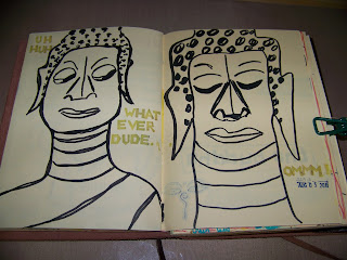 So here's what my current journal is like. There are pages with drawings, often comical ones that I didn't intend to be that way when I began. Is it just me, or is that a snooty Buddha on the left side? He looked snobbish to me, and this page makes me giggle. These are some of the first Buddha drawings I did in this book.